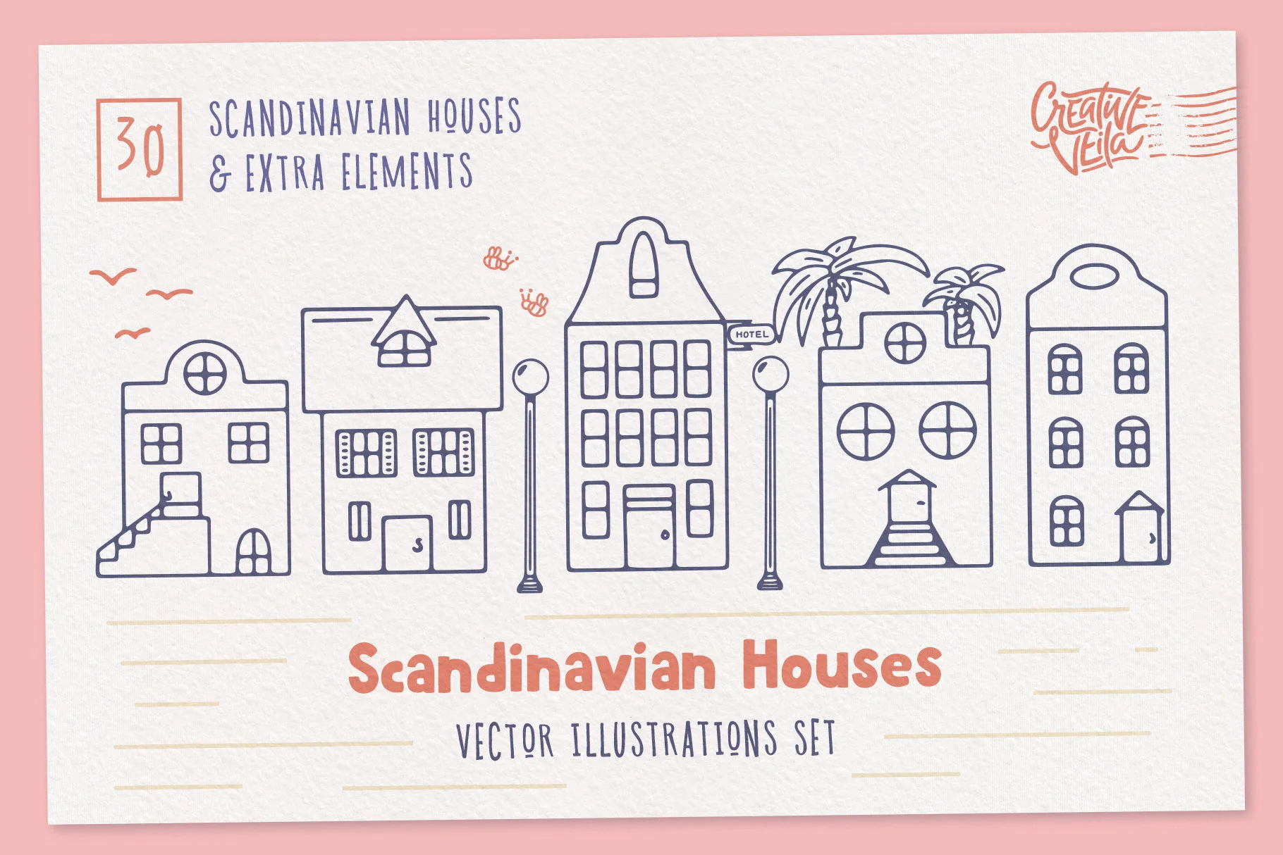 With this handy vector set, build a street of your dream planting adorable house illustrations in Scandinavian style one by one! You can get 30 hand-drawn building illustrations inspired by the iconic Scandinavian architecture.